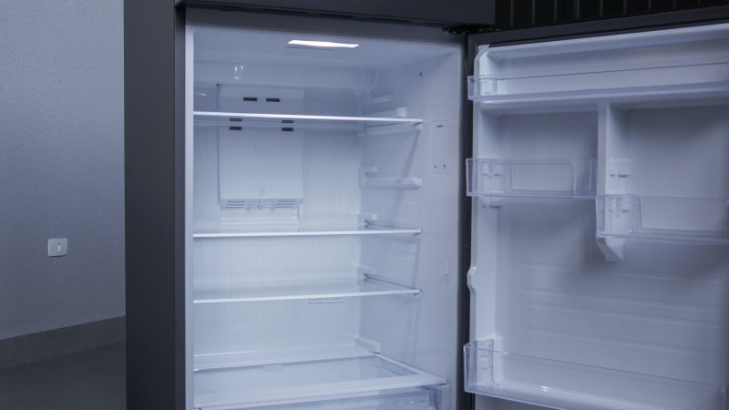 É somente uma luz no topo do refrigerador, mas ilumina bem tanto a cavidade interna quanto a porta. A luz é branca e um tanto fria, pouco acima de 6000K. A luz só é útil para o refrigerador, o freezer não possui iluminação interna e a luz do refrigerador não chega a iluminar o freezer em si. Por sinal ali nem há detecção de porta aberta.