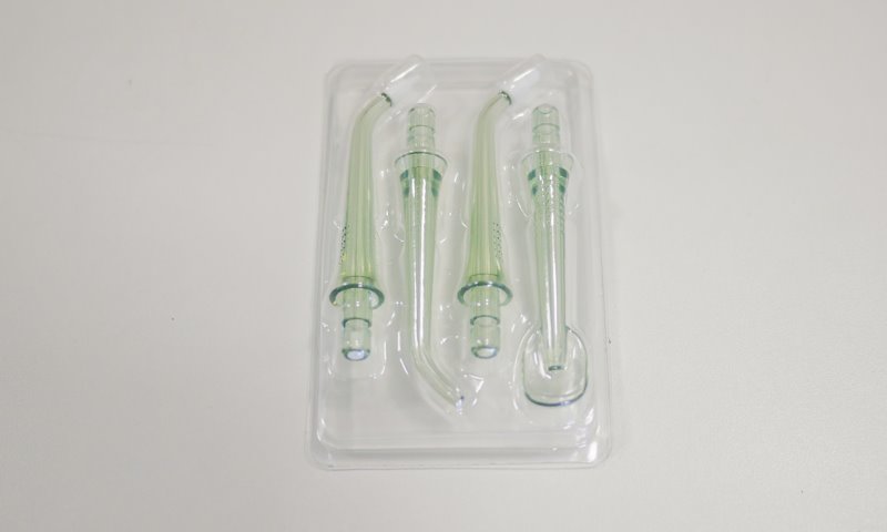 O conjunto vem com 4 ponteiras diferentes. Uma básica para limpar entre os dentes, uma periodontal para limpeza mais sensível da gengiva, outra com escova para aqueles que usam aparelho fixo e uma bem diferente, para irrigar a língua. Por sinal esse para irrigar a língua surpreendeu. Criou um atrito interessante, e no jato forte até deixou um leve desconforto depois de usar.