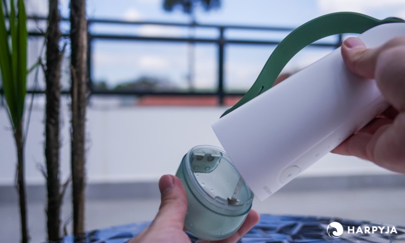 Algo que vale se atentar é carregar com água o produto somente quando for usar. Tanto para evitar da água parada proliferar algas ou biofilme e também para evitar que a água fique com gosto quando usada. Nos testes que deixávamos a água parada dentro do produto por um tempo, quando usado vinha um gosto de “água de mangueira de jardim”.