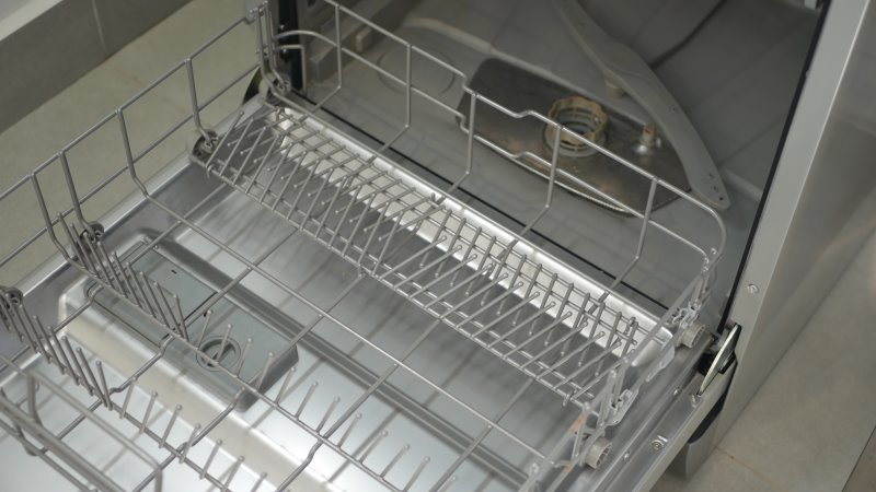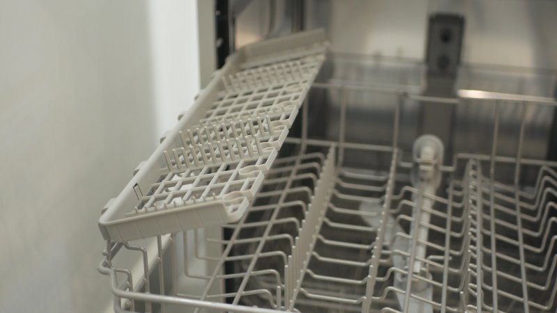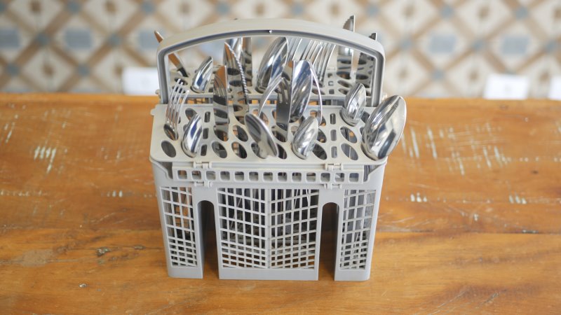 O cesto é largo, com dois lados para armazenar talheres. Quando fechado é todo perfurado. Às vezes, dependendo do talher, ele não cabe nos furos então muitas vezes será necessário usá-lo aberto e ocupando assim um pouco mais de espaço. A vantagem é que o cesto pode caber em vários sentidos, entretanto pode ser chato de encaixar entorno das diversas hastes da prateleira inferior.