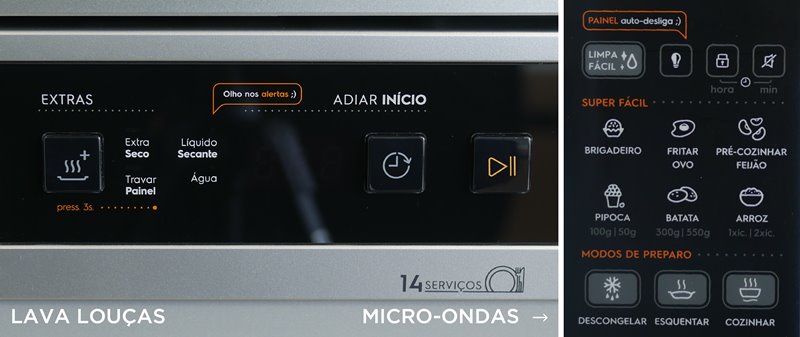 As indicações no painel são através de LEDs alaranjados e o display que indica tempo de ciclo, tempo remanescente durante o funcionamento e também auxilia para programar o adiamento do início. É possível adiar o início em até 24h, em intervalos de uma hora.