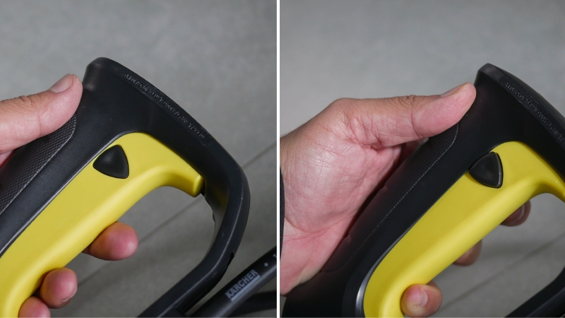 Agradou o encaixe para descansar a pistola na estrutura do corpo. Ao lado da alça há um encaixe que segura a pistola mesmo que esteja com a lança conectada nela. É útil principalmente quando se está com a lavadora parada, pois como não tem como travar a pistola, e qualquer batida ali durante o manuseio irá desencaixar.