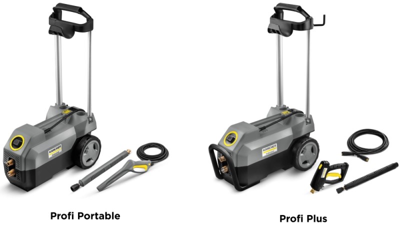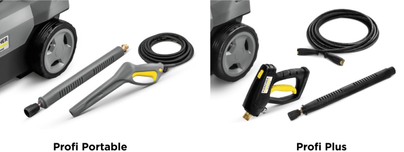 O modelo apresenta variações que atendem a diferentes perfis de uso, indo desde a versão Profi Portable (apenas o módulo de pressão) até a Profi Plus, que traz diferenciais na pistola, suportes extras e pegadores frontais.