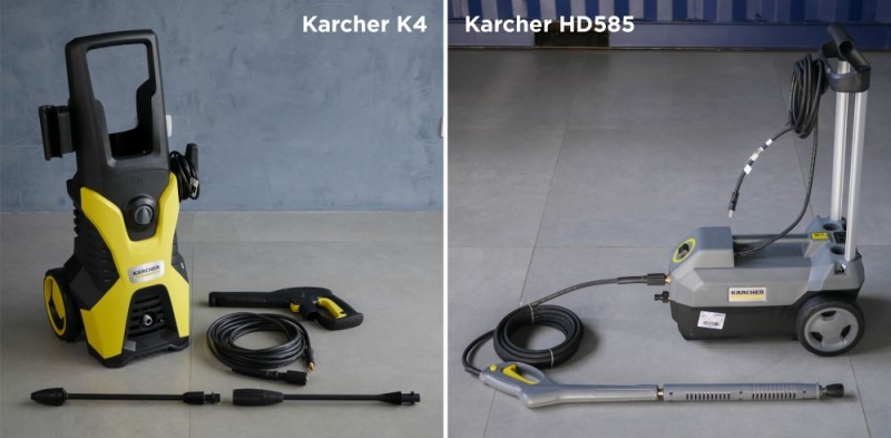 Enquanto modelos como a Karcher K4 apresentam uma carcaça que parece integrar e esconder quase totalmente os componentes internos em uma peça de plástico único, a lavadora de alta pressão Karcher HD 585 acaba sendo mais simples quanto a sua carenagem plástica, sem cobrir 100% do modelo, expondo na frente o conjunto de motor e bomba.