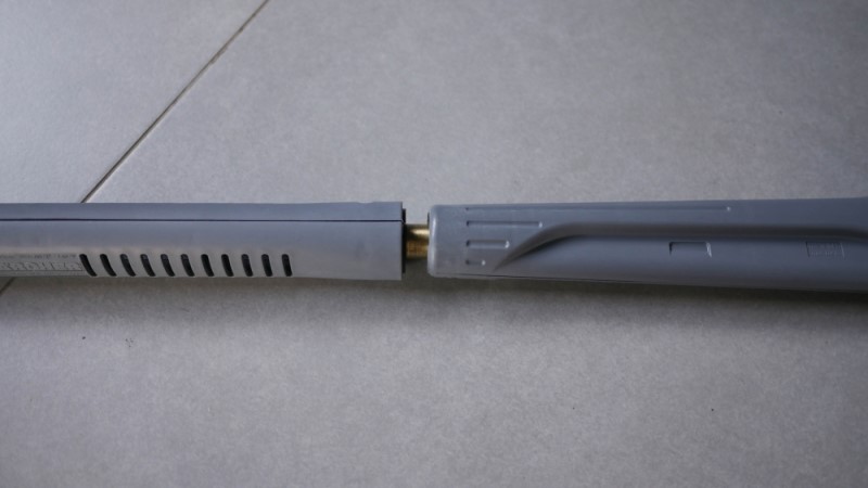 A lança é bem robusta, sendo composta internamente por um cano principal de aço. As pontas são de latão, soldadas tanto na ponteira do bico quanto na conexão de entrada.
