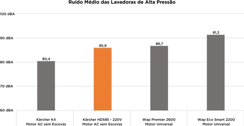 Embora o nível de ruído seja alto, a frequência sonora dos motores de indução profissionais (AC sem escovas) é menos estridente que a dos motores universais utilizadas em lavadoras de alta pressão residenciais