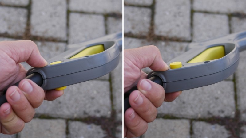 Este detalhe pode passar despercebido por quem usa a lavadora de alta pressão Karcher HD 585 e arrisca disparos acidentais caso a trava seja forçada sem estar devidamente encaixada.
