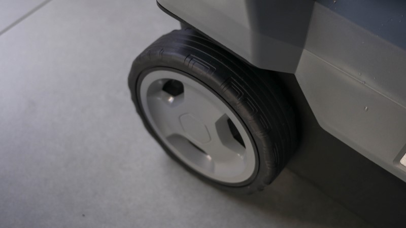 Para facilitar o transporte, a lavadora de alta pressão Karcher HD 585 tem rodas. São plásticas, mas de espessura generosa para garantir estabilidade ao conjunto apesar do peso do motor e bomba.