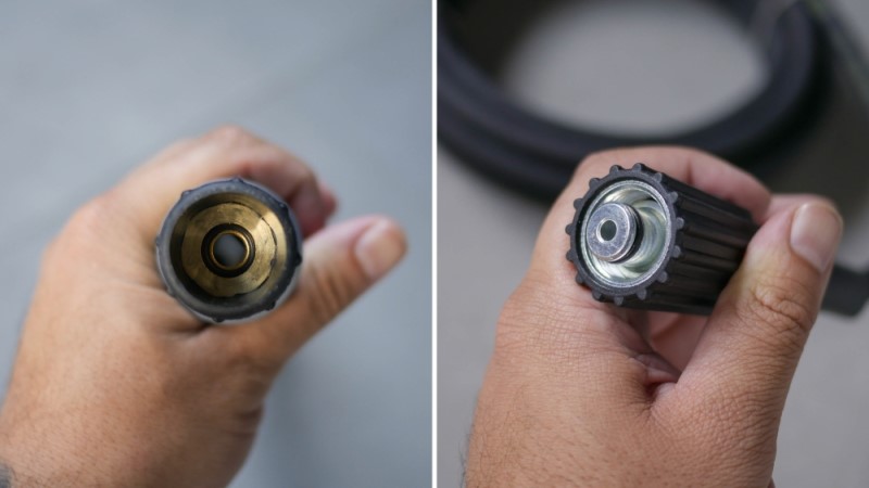 As conexões das mangueiras são de aço zincado em padrão de engate rápido com rosca que se conectam bem na lavadora. Já a outra ponta, está permanentemente fixada na pistola.