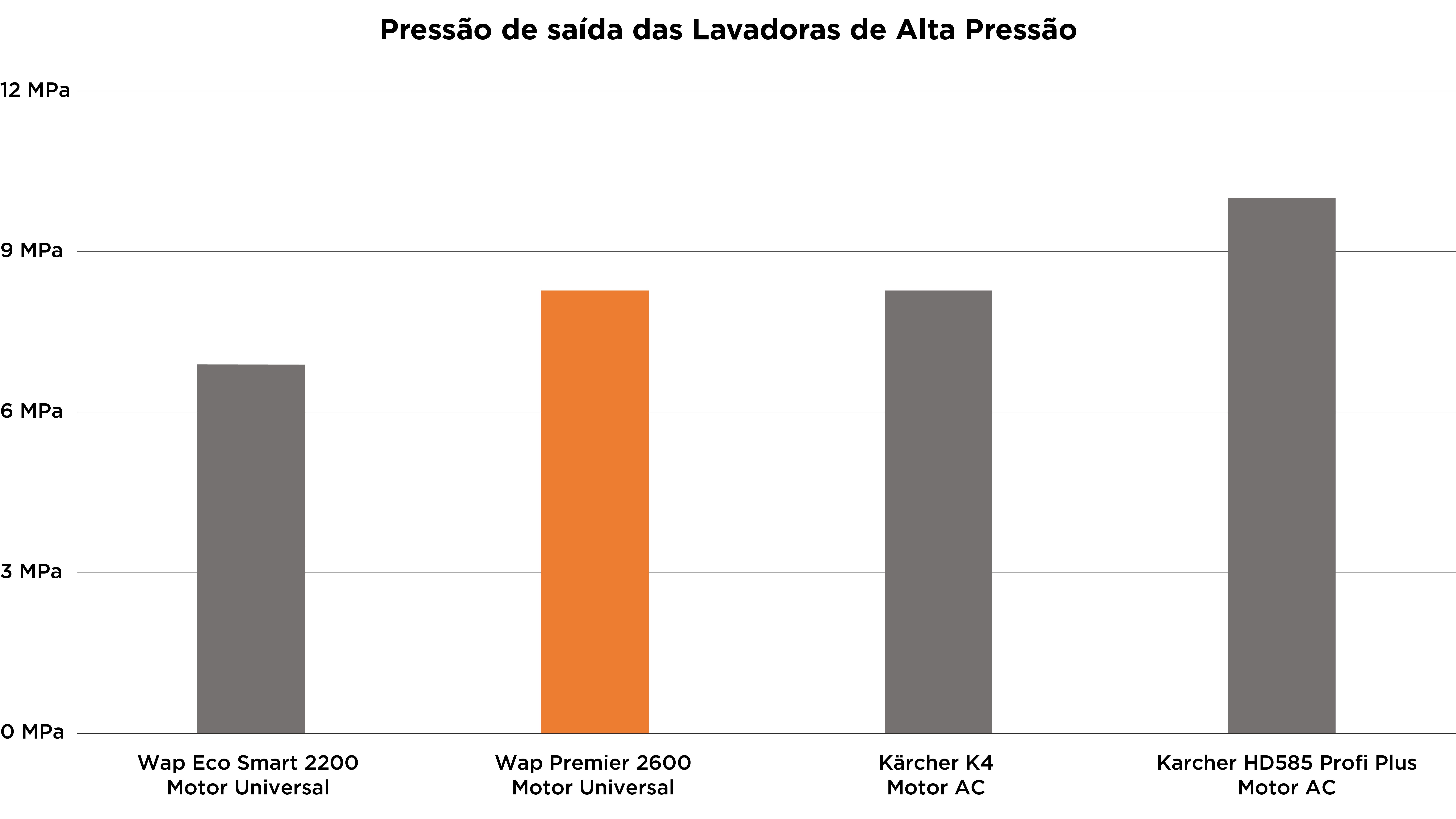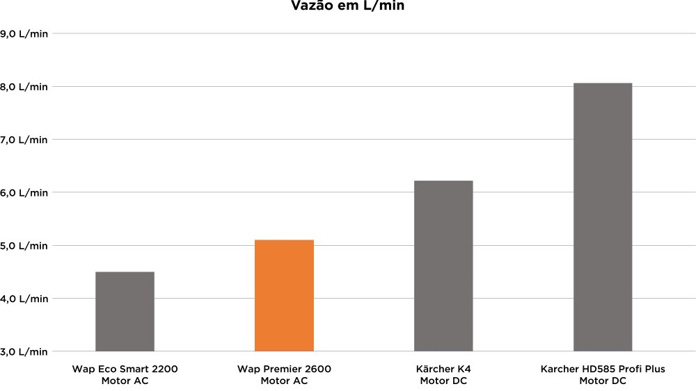 Além disso, a vazão é bem próxima, com cerca de 5,1 L/min, o que traz uma melhor aplicabilidade da lavadora de alta pressão.