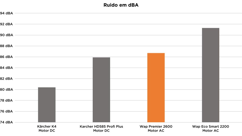 Comparando com outras lavadoras de alta pressão, a Wap Premier 2600 não chega a ser tão ruidosa quanto o modelo Eco Smart 2200, mas que não traz um conforto sonoro como a Karcher K4, com cerca de 86 dBA.