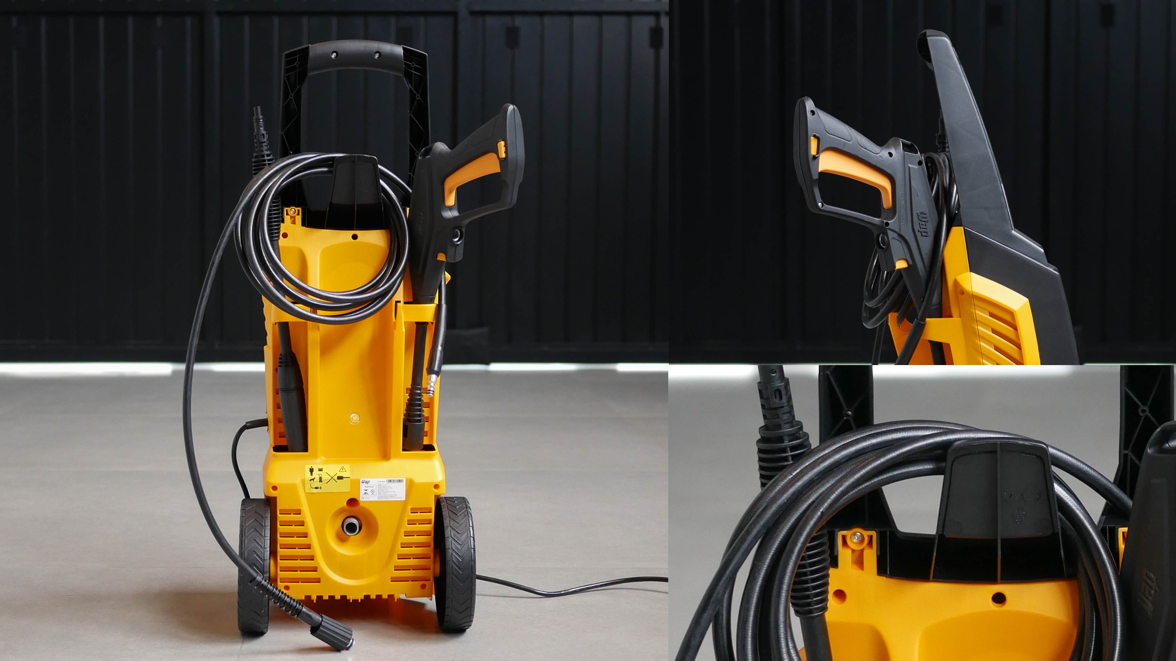 Durante o transporte, vai perceber que a lavadora de alta pressão Wap Premier 2600 foi desenhada para comportar bem todos seus acessórios, sejam mangueiras, cabo de alimentação, lanças, bicos e pistola.