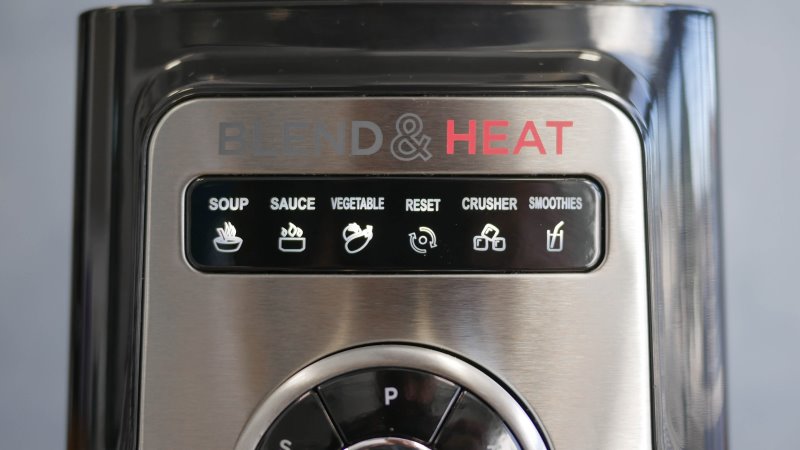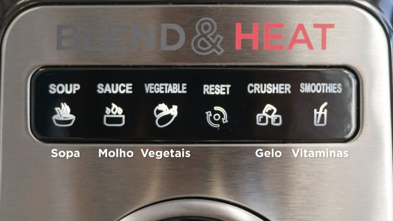 O material escrito aparece em chumbo e vermelho, trazendo detalhes mais vívidos para a combinação acanhada de preto e inox. Surge sem erros tanto no plástico quanto no inox, o que é um tanto difícil. Temos Blend&Heat (Liquidificar e Aquecer) em destaque, e a logo da marca abaixo do seletor.
