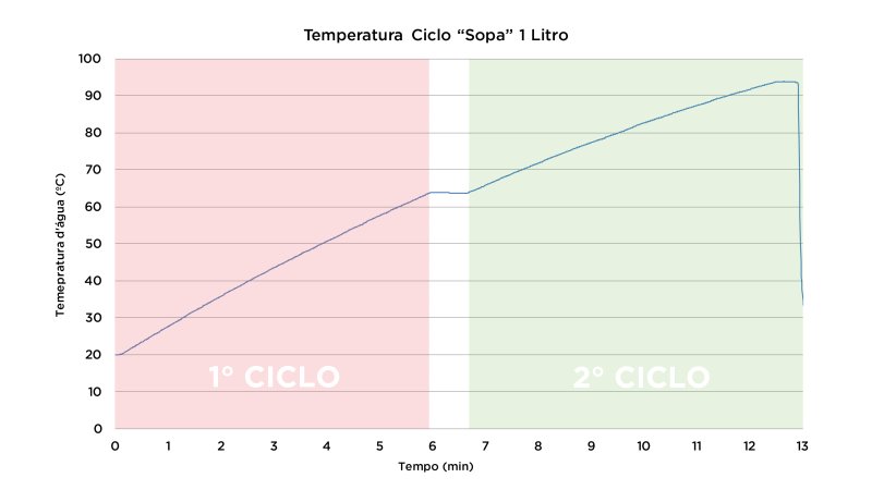 Utilizando a função Sopa com 1 litro de líquido no interior, a temperatura partiu de 20°C para 64°C. O aumento é considerável, considerando o tempo de 6 minutos. Deixando o programa Sopa correr mais uma vez, o líquido quase ferveu! Alcançou o pico de 94°C.