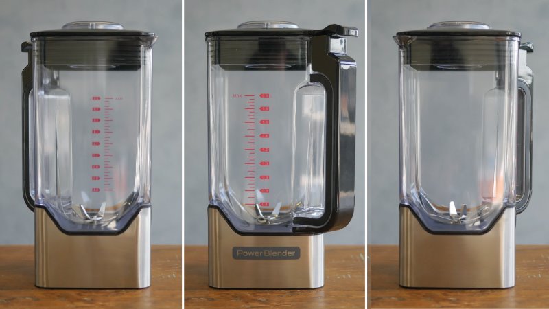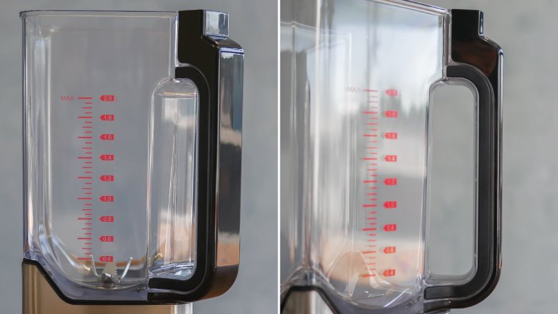 Seguindo o perfil quadrado do corpo, o interior da jarra é quadrado com um dos lados chanfrados, dando mais espaço para a alça. Seu material principal é Tritan, um plástico muito resistente a impactos e quedas, com inox fazendo o contorno abaixo e integrando as lâminas.