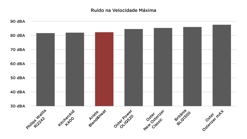 Na velocidade máxima, o liquidificador da Ariete fica menos ruidoso que a média com 82 dBA. Um ponto positivo é que seu perfil é menos agudo do que a maioria, assim incomoda menos o ouvido. O barulho fica mais grave entre as velocidades mais baixas, e atinge 67dBA na mínima. É bem perceptível, mas entre liquidificadores é silencioso.
