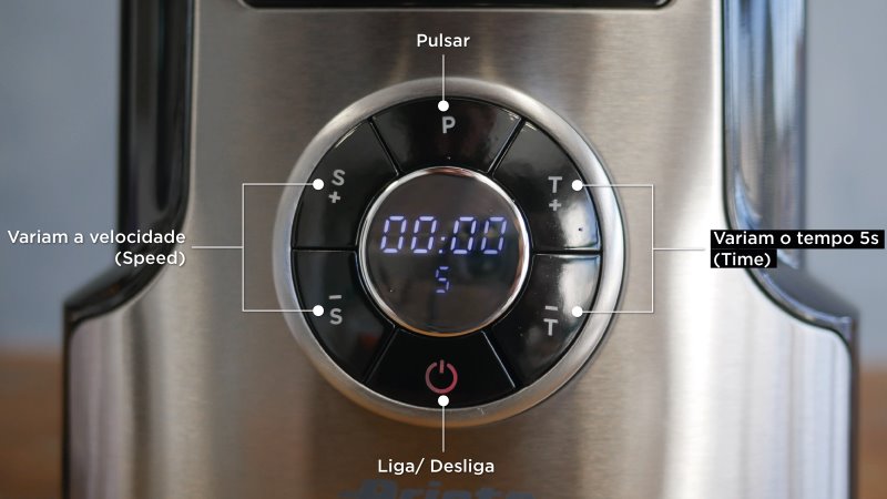 No centro do aro há 6 botões e um display LED. Parece demais para um só liquidificador, mas são bem compreensíveis.