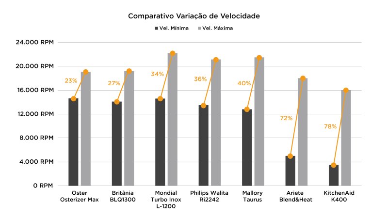 O Blend&Heat possui 10 velocidades, e todas elas são variações significativas entre si. A mínima atinge 5000 rotações por minuto e a máxima 18000 RPM. Essa diferença de 72% entre as velocidades é uma das maiores que já presenciamos. Torna o liquidificador realmente versátil e com entregas diferentes dependendo da velocidade que trabalha.