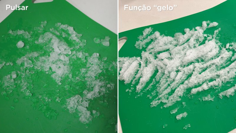 Por outro lado, este liquidificador não lidou bem triturando gelo ou frutas congeladas. Mesmo pulsando algumas vezes a mais do que o normal, sobraram alguns cubos grandes. Por outro lado, ao utilizar a função para Gelo, o resultado foi bem diferente. Os cubos viraram neve, não deixando nenhum pedaço maior. Se for trabalhar com esse tipo de alimento, vale fazer uso da função ou a entrega será abaixo da média.