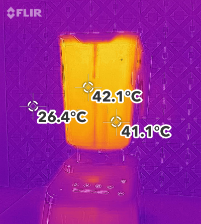 Não há elemento de aquecimento na jarra, porém quando o ciclo de sopa é concluído, o líquido está aquecido. Isso é devido ao atrito das lâminas com o alimento durante o funcionamento em velocidade alta. Fizemos 400 e 800 gramas de sopa. Quanto menos líquido, mais quente é o resultado final. Com 800 gramas a temperatura final ficou em torno de 45°C, e com 400 gramas a temperatura final foi 49°C.