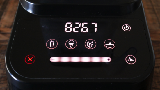 No painel há um display que mostra o tempo de funcionamento quando rodando o liquidificador no modo manual (através de um seletor de 6 velocidades), ou mostra o tempo remanescente para concluir o ciclo quando em modo automático.