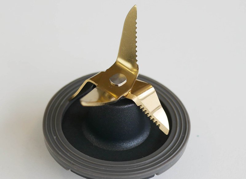 As facas ficam presas em um bloco de metal de ótima qualidade e de acabamento impecável. A borracha de vedação, que assenta sobre esse bloco metálico, também é de ótima qualidade e encaixa com muita facilidade.