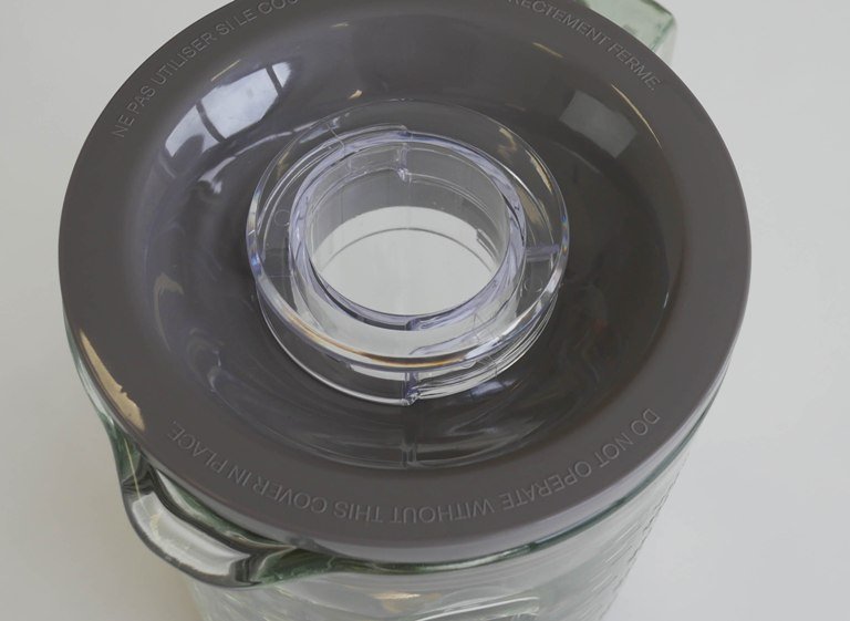 A tampa é grossa, de plástico lustroso cinza co injetada com uma borracha de vedação de 5 camadas! O topo da tampa é curvado para o centro quase como um funil para auxiliar a entrada de alimentos usando a tampa dosadora, que trava no topo e quase veda. É feita de plástico transparente (provavelmente SAN), com um bom acabamento, mas não possui marcação de volume ou furo no centro para dosar alimentos de forma lenta. Tem uma base super larga para assentar na superfície como um copo.