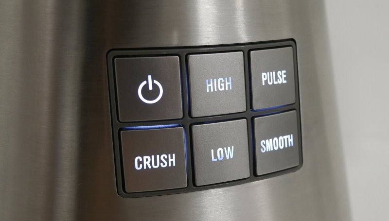 No centro do corpo há 6 botões para o acionamento do liquidificador. São botões plásticos mas muito parecidos com a cor do inox. Há um LED por trás dos botões e acendem de acordo com a função selecionada.
