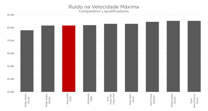 O ruído do liquidificador depende bastante de sua velocidade. Varia de 70dBA a 82dBA, entre as velocidades mínima e máxima. Comparando com outros liquidificadores, está numa boa posição, mas pode ser barulhento na velocidade máxima. O K400 atingia um ruído parecido na velocidade máxima, porém também entregava mais rotações por minuto.