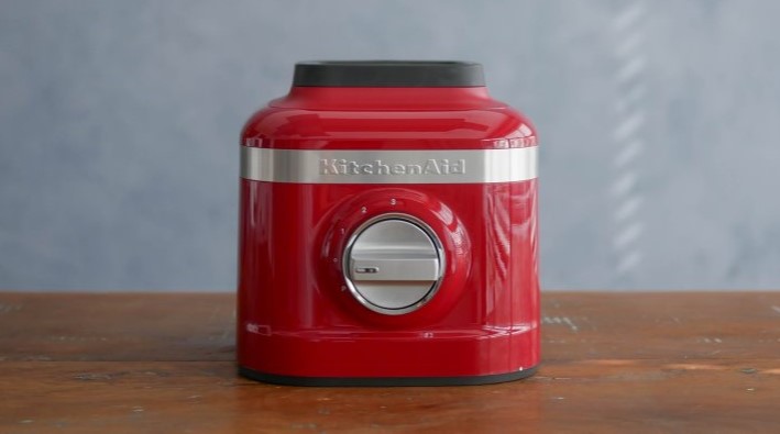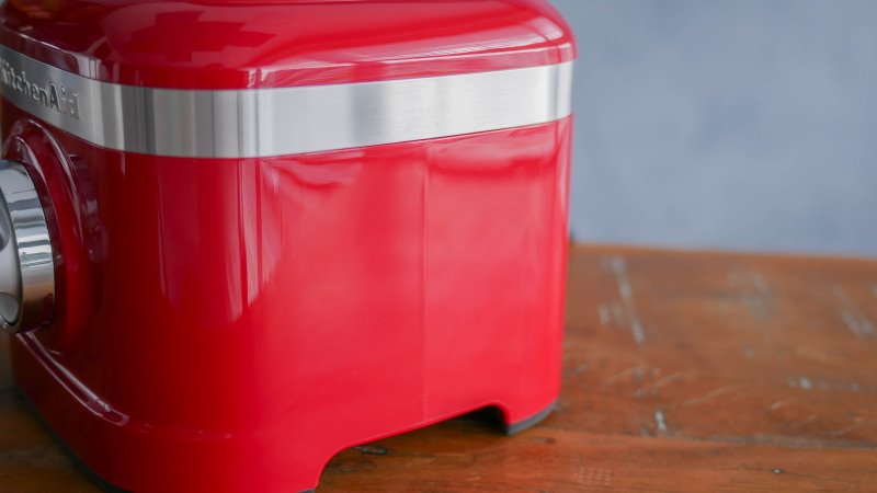 A base se apresenta como um bloco, ostentando a cor clássica da KitchenAid “Empire Red”. A tonalidade rubra é muito próxima da pintura metálica, houve esforço para fazer isso. Uma faixa que envolve o conjunto e o seletor, ambos cromados, são o contraponto para o vermelho. Funciona bem esteticamente, e conversa com o resto de sua linha de produtos.