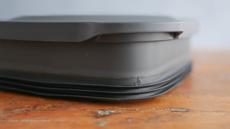 O lado externo da tampa é fácil de limpar, embora ainda possa ser riscado. Será útil utilizar uma escova na área de borracha para tirar qualquer sujeira que fique entre as camadas de borracha. Internamente há uma série de curvas que atrapalham a limpeza adequada da peça.