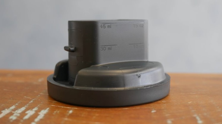 A vedação da tampa é perfeita. Não vazou inclinando para nenhum lado, mas também não há abertura ou grades para pôr líquidos. O único ponto de escape quando fechado adequadamente é o buraco da tampa dosadora no topo, com marcações de 30mL e 45mL.