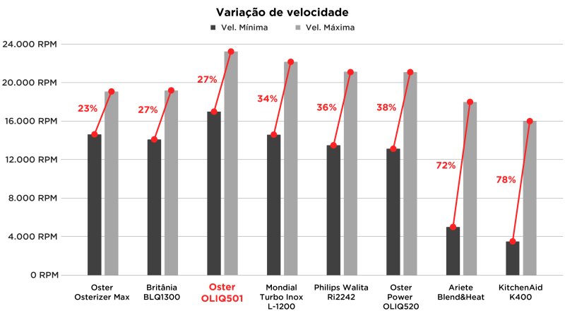 Este Oster Power tem 5 velocidades. Variando de 17000 rotações por minuto a 23250 RPM. Cada velocidade é suficientemente distinta entre si, porém a diferença ainda é baixa, apenas 27%. O modelo entrega apenas velocidades altas, faltam as rotações mais baixas que vimos no OLIQ520. Aqui, algumas são até maiores que o 520. As opções poderiam estar melhor distribuídas para entregar uma variedade maior de cortes.