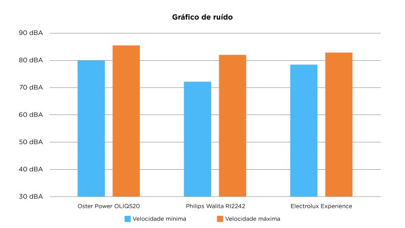 A primeira e a última velocidade apresentam uma diferença notável de ruído, de 76 a 85 dBA a variação é facilmente audível. A característica do ruído desse modelo da Oster é ser mais grave, especialmente nas velocidades menores onde o som pode assustar apesar do liquidificador estar funcionando normalmente. Nas velocidas médias e altas o ruído não aparece com tanta frequência.