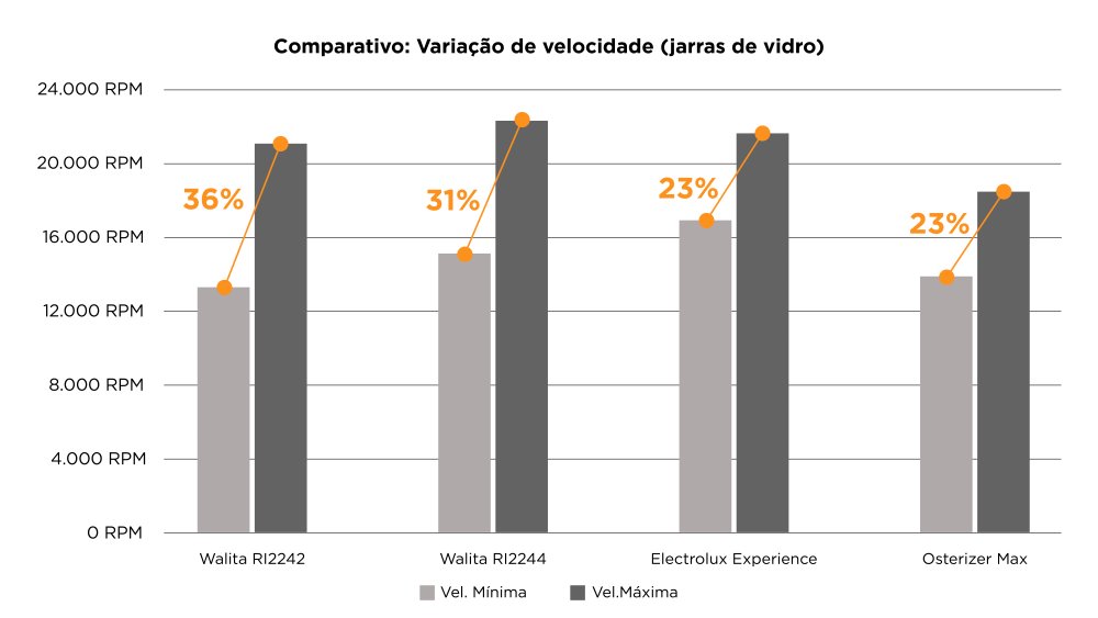 Assim como o RI2244, esse modelo também possui 12 velocidades, mas faz melhor proveito delas em relação à versão com jarra de tritan. Das 12 velocidades disponíveis no seletor, 8 delas tem uma diferença considerável entre elas. O número poderia ser maior, mas fica na frente das 6 velocidades consideradas do outro modelo. A variação também é um pouco maior: 36% e fica na frente de outros modelos de liquidificador. Na primeira posição do seletor medimos 13500 RPM (rotações por minuto), e na velocidade máxima estão cerca de 21150 RPM.