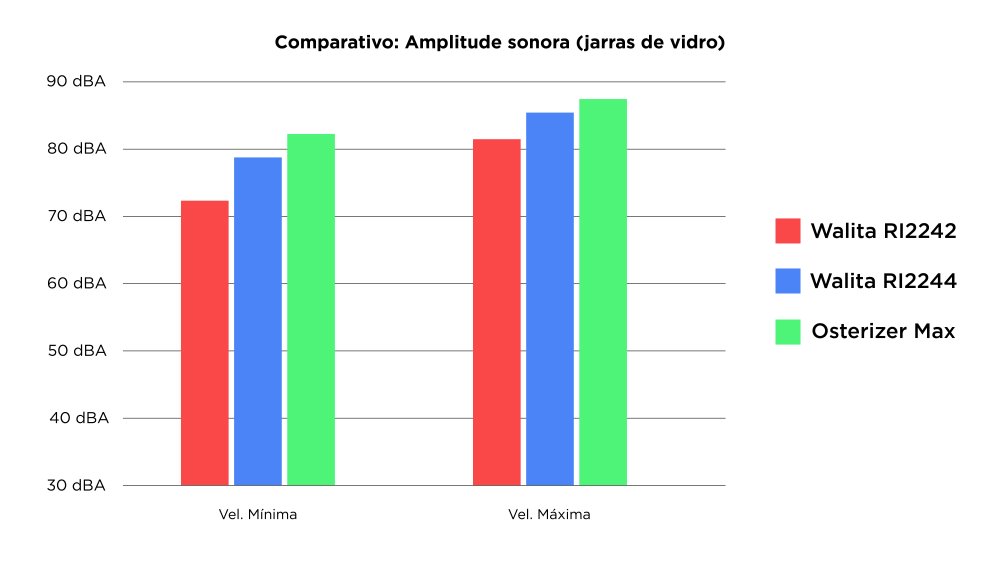 A mudança na jarra não afetou somente o corte do produto, e o ruído também interrompeu consideravelmente. Se no RI2244 observamos 79 dBA de ruído na velocidade mínima, o modelo com jarra de vidro marca somente 72 dBA. A diferença é extremamente notável e o barulho tem intensidade bem menor que muitos outros liquidificadores apreciados, mesmo de outras marcas. Na velocidade máxima registra 82 dBA, uma queda de 3 dBA em relação à versão com jarra de tritan.