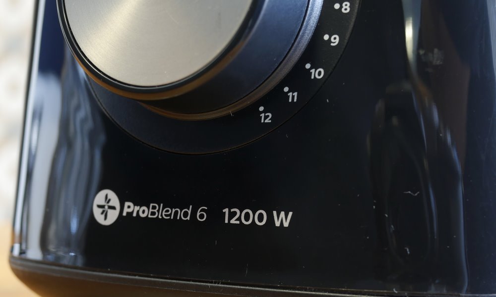 As informações escritas aparecem em cores contrastantes, as velocidades estão impressas na cor branca ao redor do seletor e a marcação de ProBlend 6 com o desenho das lâminas aparece próximo da base. A qualidade da impressão é boa, e não tem sinais de estar descascando no momento (como observado no RI2244) ou que irá descascar com tanta facilidade. Pode ser que esse problema varie bastante entre os lotes dos liquidificadores da Série 5000, ou que a superfície plástica deste modelo garanta uma impressão de melhor qualidade que a de inox do RI2244.