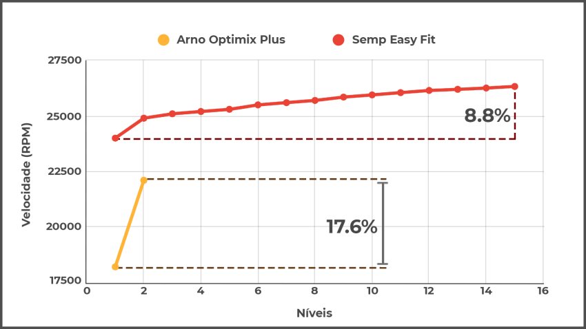 Mesmo com duas velocidades a variação do Optimix é o dobro deste Semp. Outra informação do gráfico que vale salientar é a velocidade de funcionamento. São rotações bem altas, das mais altas que já vimos até o momento.