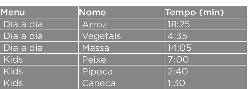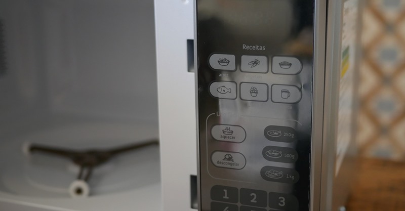 A interface fica posicionada à direita da porta e possui uma boa organização, são seis receitas pré-definidas sendo elas: arroz, vegetais, peixe, pipoca e caneca (líquidos).