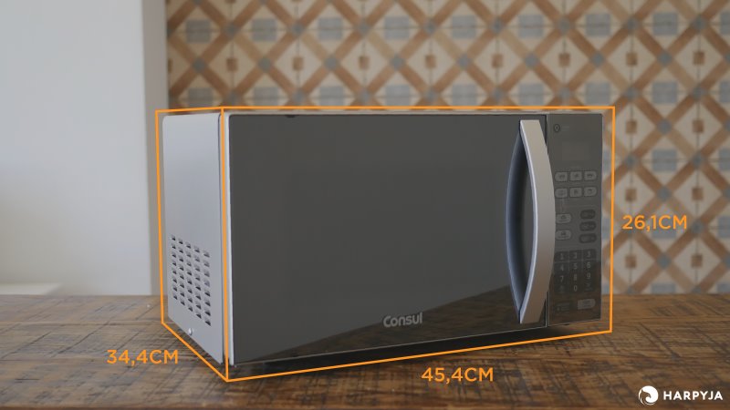 Sendo um micro-ondas da linha compacta as dimensões externas são menores, o conjunto possui: 26,1 cm de altura por 45,4 cm de largura e 34,4 cm de profundidade.