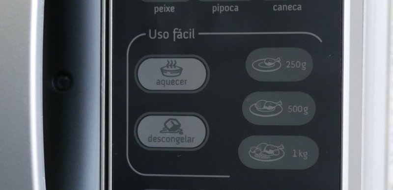 Logo abaixo, é possível encontrar um conjunto de botões que servem para configurar as funções aquecer e descongelar, que por sinal não possui configurações específicas para determinados tipos de alimentos, sendo somente possível configurar essas funções pelo peso do alimento em 3 opções diferentes: 250g, 500g e 1 kg. A opção de descongelar trabalha ligando na potência máxima por alguns minutos e depois disso trabalha em 50% da potência.