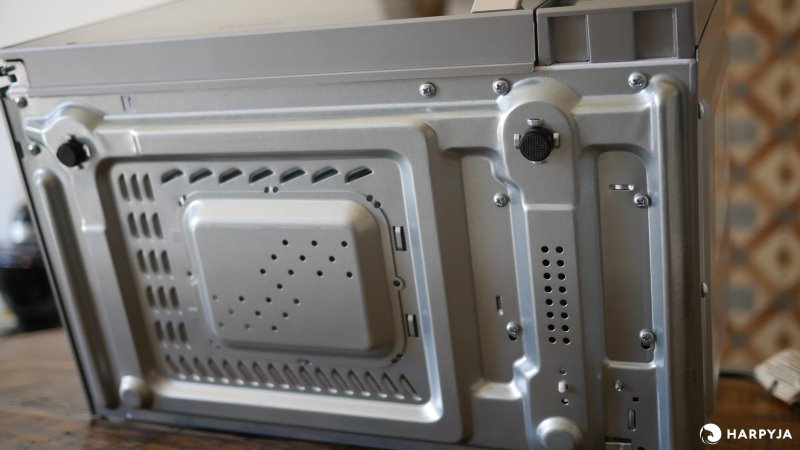O gabinete é feito com uma placa de metal, em formato de U e pintado de cinza. Possui um bom encaixe com parafusos prateados nas laterais. Seria interessante uns parafusos um pouco mais discretos, mas é meio comum ver isso em micro-ondas. Indo para a traseira a pintura é diferente, esmaltada na cor branca.