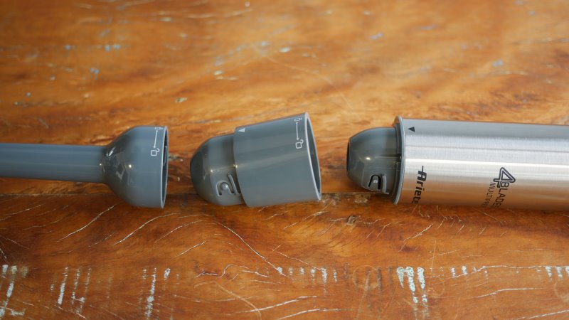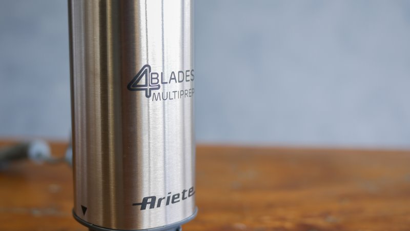 Invertendo a lógica do corpo desse mixer Ariete, sua haste é quase totalmente metálica, com somente o encaixe no topo sendo plástico. São 20,6 cm de extensão, abrigando na ponta um conjunto de 4 lâminas.