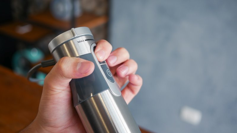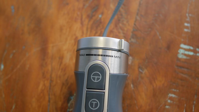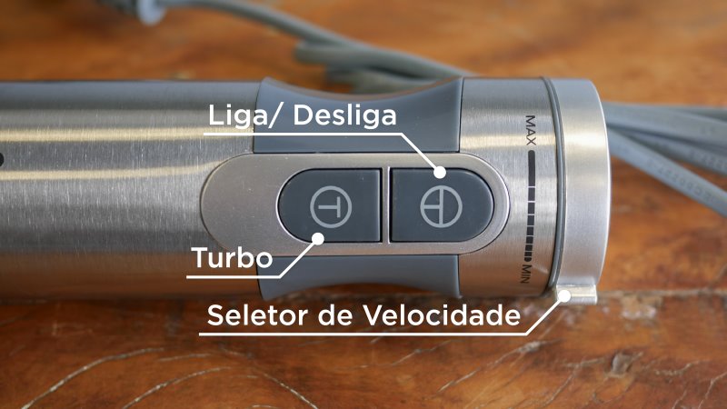 São 2 botões que precisam ser segurados para funcionar e o seletor de velocidade. O de cima liga o mixer na velocidade desejada, enquanto o botão de baixo ativa o “Turbo”. O seletor de velocidade pode ser rotacionado entre 10 posições.