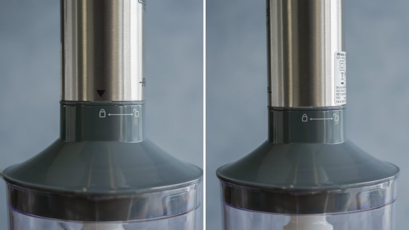Todos os acessórios desse mixer processador se encaixam em duas posições diferentes, a cada 180°. A forma preferida é alinhando a seta na lateral do mixer com o símbolo de trava no acessório. Porém se preferir alinhar o símbolo do acessório com o centro do mixer, há o mesmo efeito. São duas formas intuitivas e fáceis.