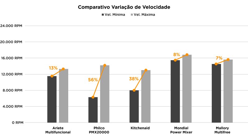 Apesar das 10 velocidades, esse mixer da Ariete só apresenta 13% de variação entre a velocidade mínima e a velocidade máxima. Na prática, isso significa que metade dessas velocidades tem uma diferença tão pequena que são essencialmente iguais.