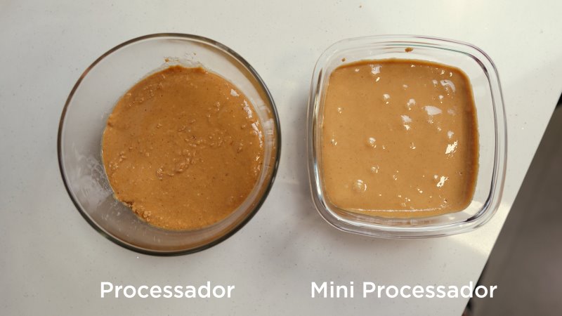 Essa situação se provou também ao fazer pasta de amendoim. O mini processador entregou uma ótima consistência em 5 minutos. No mesmo tempo, o processador grande estava com consistência ruim, pedaços e não conseguiu melhorar muito seu resultado mesmo tendo mais tempo para isso.
