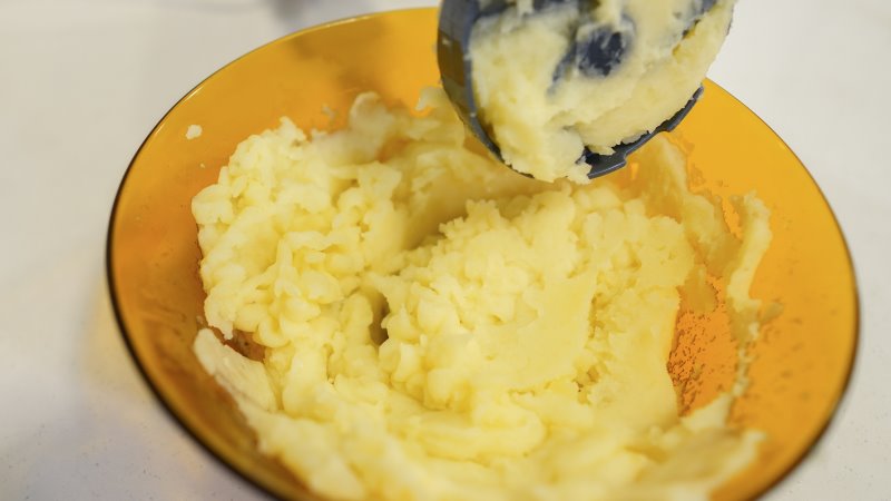 Este promete fazer purê de batata. E funciona de maneira curiosa. Diferente das lâminas habituais, o espremedor funciona quase como pás. Puxando o alimento para ser espremido contra sua grade furada.