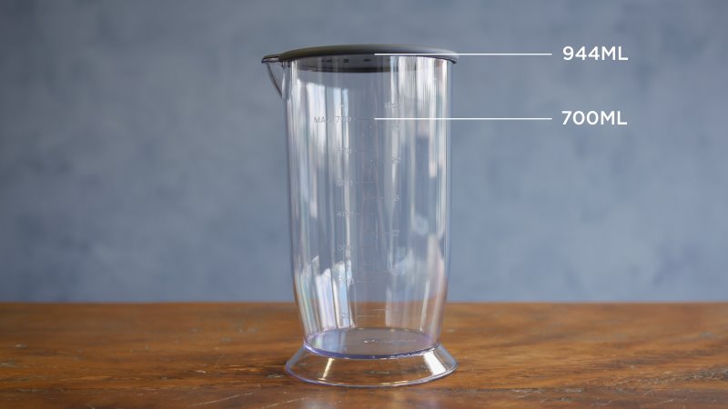 O copo que a Ariete inclui tem marcações até 700 mL, porém pode chegar a 944 mL até a tampa. Essas marcações de volume são úteis e verdadeiras, com um erro bem baixo. Você ficaria surpreso como tantas jarras de liquidificadores e processadores trazem marcações erradas.