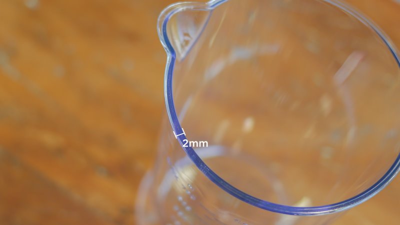 Apesar de quase atingir 1L até a boca, a capacidade útil do copo marca 640 mL. Significa que é possível usar esta capacidade antes do copo começar a transbordar. A peça em si é de SAN, um material um tanto quebradiço. É bom evitar quedas e choques, pois suas paredes são finas (2 milímetros) e podem trincar.